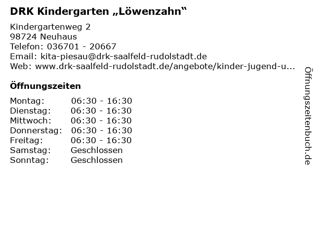 | Öffnungszeiten DRK Kindergarten „Löwenzahn“ in Neuhaus anzeigen | |
