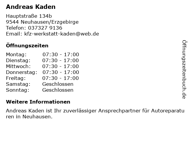 | Öffnungszeiten Andreas Kaden in Neuhausen/Erzgebirge anzeigen | |
