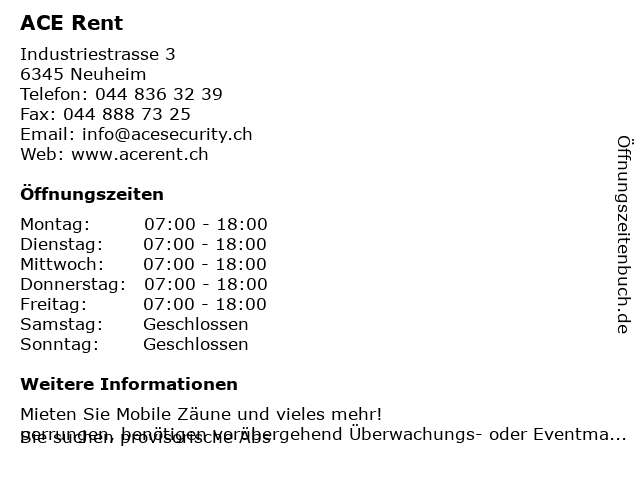 | Öffnungszeiten ACE Rent in Neuheim anzeigen | |