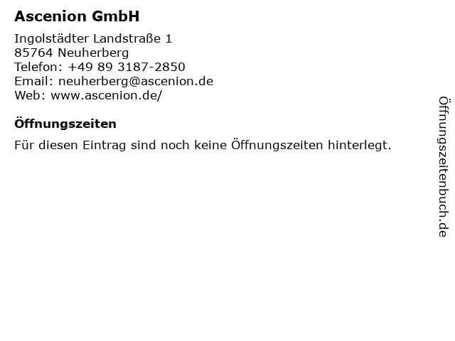 | Öffnungszeiten Ascenion GmbH in Neuherberg anzeigen | |