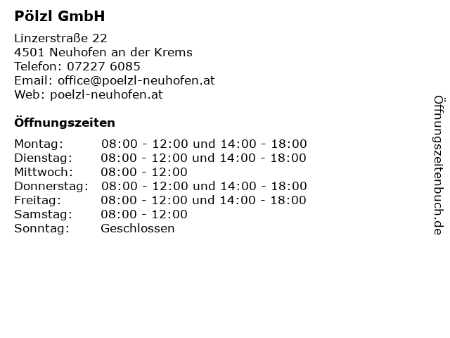 | Öffnungszeiten Pölzl GmbH in Neuhofen an der Krems anzeigen | |