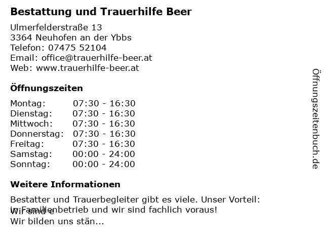 2 Bestattungsinstitut Beer - Standort Neuhofen / Ybbs (Entfernung: 0,01 km) Ulmerfelder Straße 13, 3364 Neuhofen/Ybbs 4 6 |