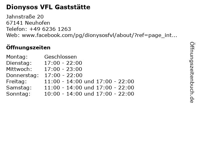 | Öffnungszeiten Dionysos VFL Gaststätte in Neuhofen anzeigen | |