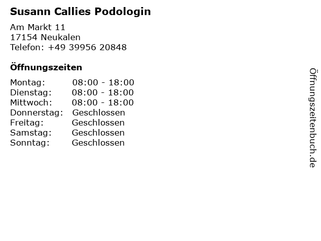 | Öffnungszeiten Susann Callies Podologin in Neukalen anzeigen | |
