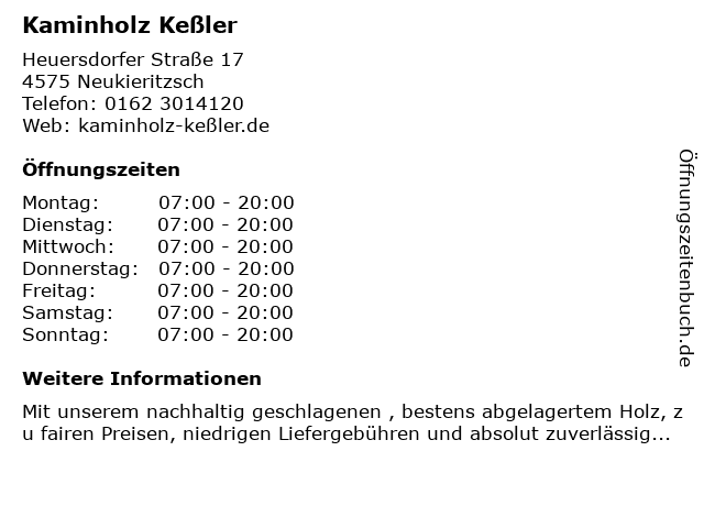 | Öffnungszeiten Kaminholz Keßler in Neukieritzsch anzeigen | |