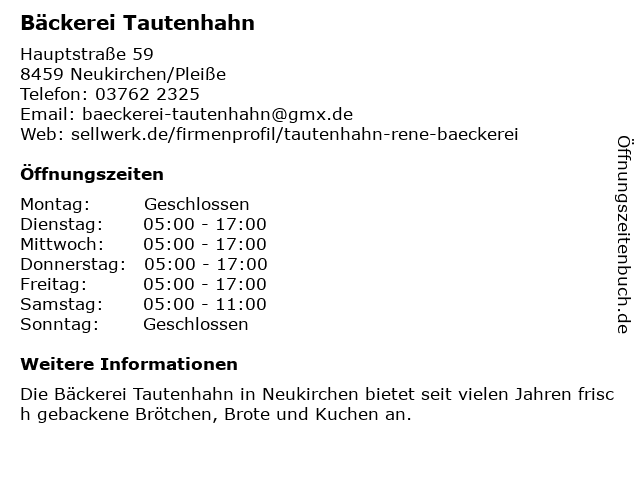 | Öffnungszeiten Bäckerei Tautenhahn in Neukirchen/Pleiße anzeigen | |