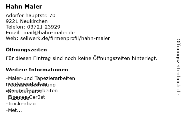 | Öffnungszeiten Hahn Maler in Neukirchen anzeigen | |