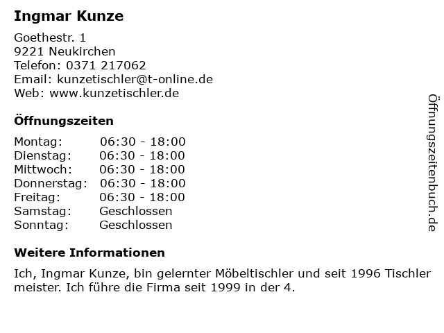| Öffnungszeiten Ingmar Kunze in Neukirchen anzeigen | |