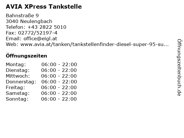 | Öffnungszeiten AVIA XPress Tankstelle in Neulengbach anzeigen | |
