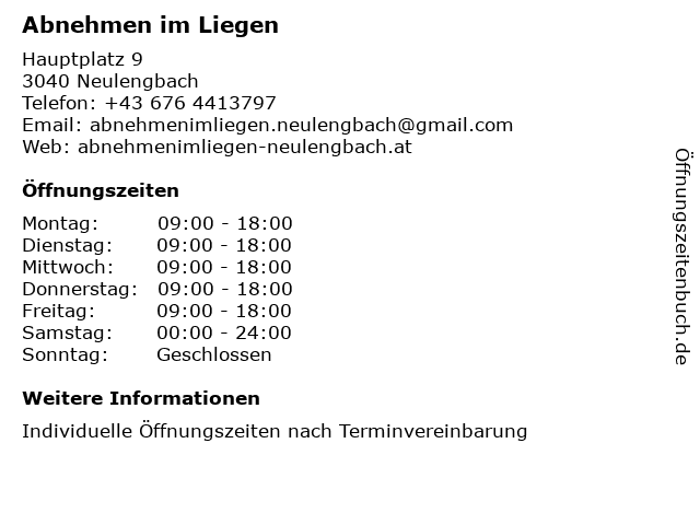 | Öffnungszeiten Abnehmen im Liegen in Neulengbach anzeigen | |