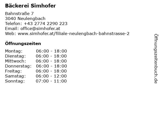 | Öffnungszeiten Bäckerei Simhofer in Neulengbach anzeigen | |