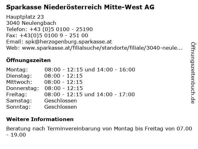 Branchen & Suchbegriffe zu Sparkasse Niederösterreich Mitte-West AG:bank, geld, hauptgeschäftsstelle, herzogenburg, konto, kredit, mitte, neulengbach, niederösterreich, sparkasse, vermögen, vorsorge, west |