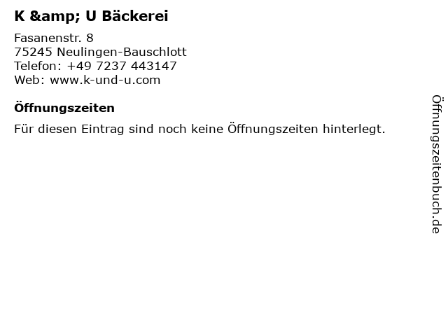 | Öffnungszeiten K & U Bäckerei in Neulingen-Bauschlott anzeigen | |