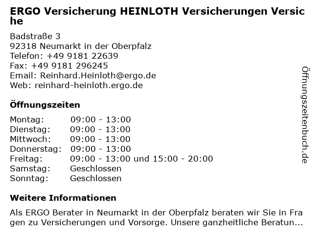 4 ERGO Versicherung Florian Pfeiffer (Entfernung: 0,20 km) Badstraße 17, 92318 Neumarkt in der Oberpfalz 5 ERGO Versicherung / DKV Thomas Stadler (Entfernung: 0,56 km) Ringstraße 33, 92318 Neumarkt in der Oberpfalz 6 ERGO Versicherung / DKV Harald Eibner (Entfernung: 0,56 km) Ringstraße 33, 92318 Neumarkt in der Oberpfalz |