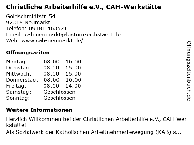 1 Christliche Arbeiter Hilfe e.V. - CAH - Werkstätte (Gebrauchtwarenmarkt) (Entfernung: 0,02 km) Goldschmidtstraße 54, 92318 Neumarkt 4 Fritz Herrmann KfzRepar.Werkstätte Sanitär Heizung (Entfernung: 10,24 km) Hauptstr. 36, 92360 Mühlhausen, Oberpfalz 6 CAH Computer-Anwendungs- und System-Programmierungs GmbH (Entfernung: 11,13 km) Langenthaler Str. 97, 92348 Berg |