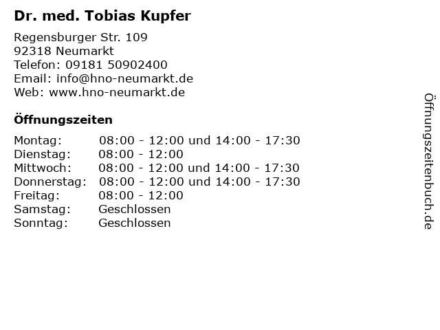 | Öffnungszeiten Dr. med. Tobias Kupfer in Neumarkt anzeigen | |