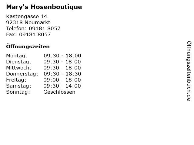 | Öffnungszeiten Mary's Hosenboutique in Neumarkt anzeigen | |