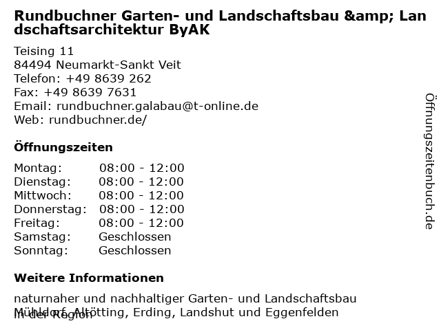 1 Friederike Rundbuchner Landschaftsarchitektur (Entfernung: 0,03 km) Teising 11, 84494 Neumarkt-Sankt Veit 2 Thomas Thienelt, Ulrike Garten- und Landschaftsbau (Entfernung: 2,33 km) Georgistr. 25, 84494 Neumarkt-Sankt Veit 4 Weindl Andreas GmbH & Co. Garten- und Landschaftsbau (Entfernung: 7,14 km) Thal 40, 84155 Bodenkirchen 5 Ludwig Weichselgartner jun Garten-Landschaftsbau (Entfernung: 7,71 km) Utzing 4, 84564 Oberbergkirchen 6 |