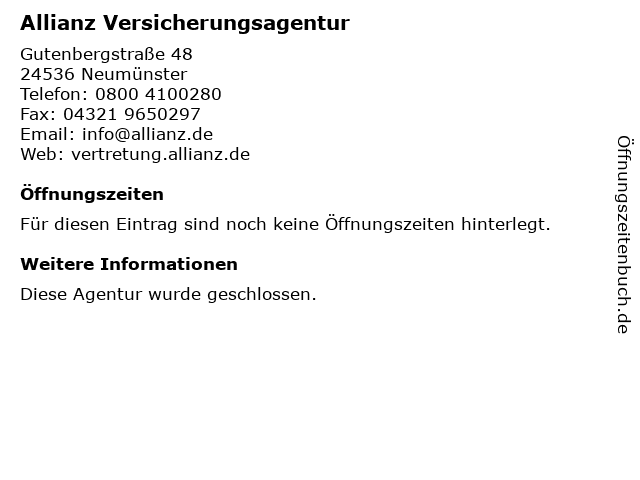 4 Allianz Versicherung Miguel Haaker Generalvertretung (Entfernung: 0,24 km) Gutenbergstraße 20 e, 24536 Neumünster 6 |