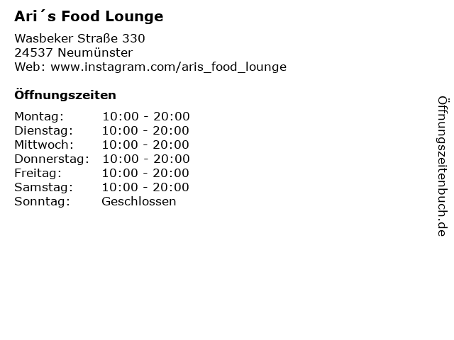 | Öffnungszeiten Ari´s Food Lounge in Neumünster anzeigen | |