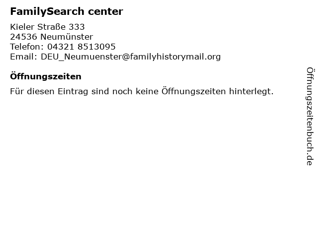 | Öffnungszeiten FamilySearch center in Neumünster anzeigen | |