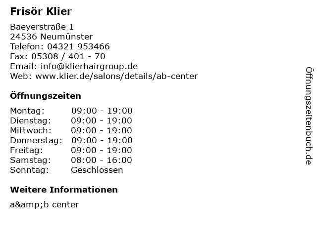 | Öffnungszeiten Frisör Klier in Neumünster anzeigen | |