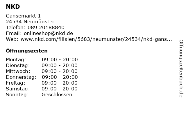 | Öffnungszeiten NKD in Neumünster anzeigen | |