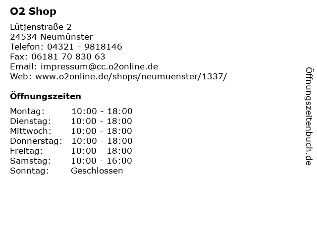 | Öffnungszeiten O2 Shop in Neumünster anzeigen | |