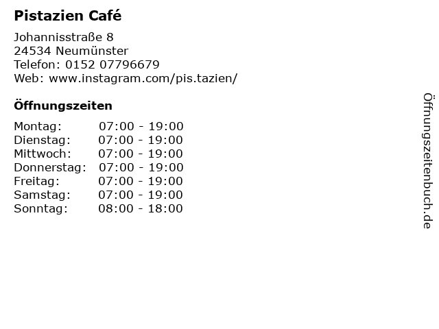 | Öffnungszeiten Pistazien Café in Neumünster anzeigen | |
