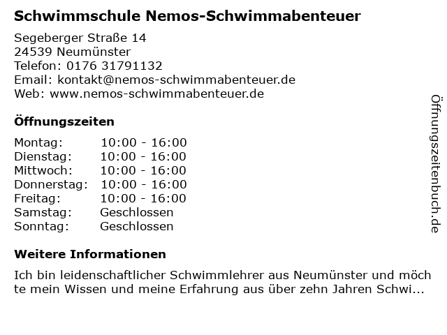 Branchen & Suchbegriffe zu Schwimmschule Nemos-Schwimmabenteuer:nemos, personal trainer, schwimmabenteuer, schwimmschule |