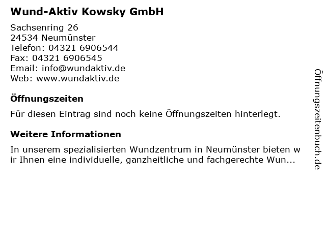 | Öffnungszeiten Wund-Aktiv Kowsky GmbH in Neumünster anzeigen | |