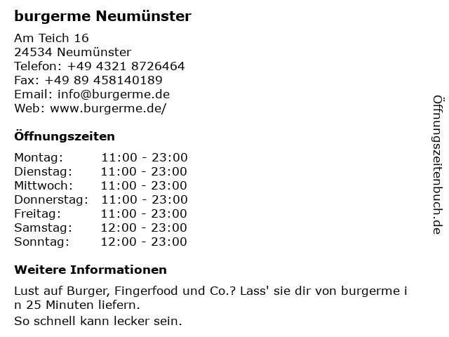 | Öffnungszeiten burgerme Neumünster in Neumünster anzeigen | |