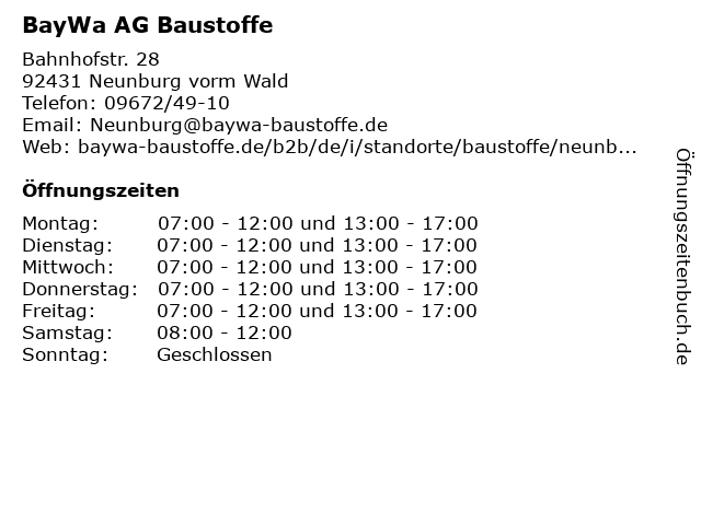 | Öffnungszeiten BayWa AG Baustoffe in Neunburg vorm Wald anzeigen | |