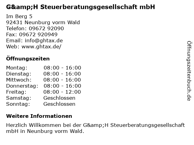 4 ECOVIS BLB Steuerberatungsgesellschaft mbH Niederlassung Maxhütte-Haidhof, Außenstelle Schwarzenfeld (Entfernung: 18,46 km) Neue Amberger Straße 18, 92521 Schwarzenfeld 5 Treukontax Steuerberatungsgesellschaft mbH (Entfernung: 18,47 km) Oberviechtacher Straße 13, 92507 Nabburg 6 Treukontax Steuerberatungsgesellschaft mbH Außenstelle Nabburg (Entfernung: 18,77 km) Unterer Markt 6, 92507 Nabburg |