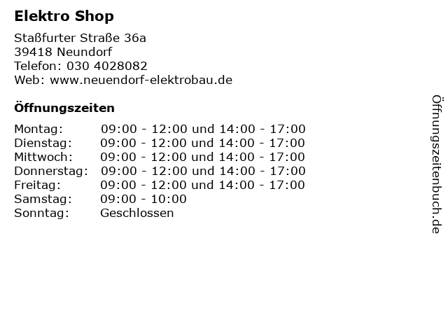 | Öffnungszeiten Elektro Shop in Neundorf anzeigen | |