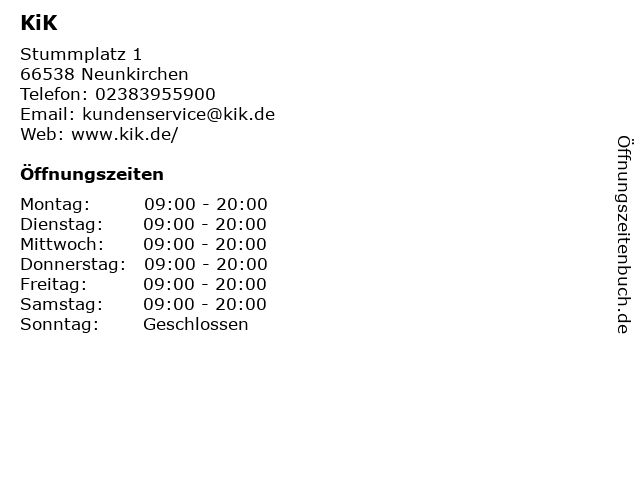 | Öffnungszeiten KiK in Neunkirchen anzeigen | |