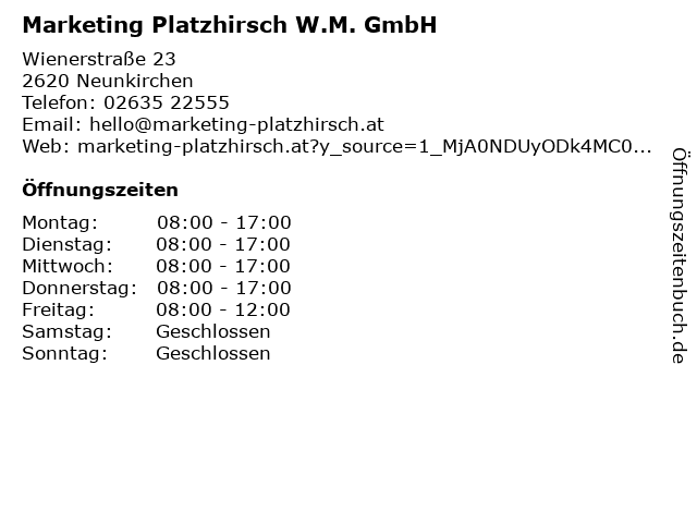 2 MSM Germany - Marketing, Service & Management GmbH (Entfernung: 15,78 km) Hauptplatz 19/2/3, 2700 Wiener Neustadt 4 Online Marketing Agentur | Digitalagentur - NDA GmbH (Entfernung: 16,46 km) Industriegasse 6, 2700 Wiener Neustadt 6 |