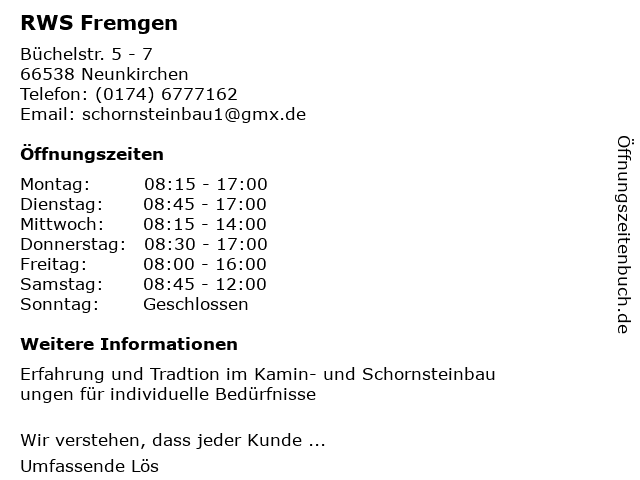 | Öffnungszeiten RWS Fremgen in Neunkirchen anzeigen | |
