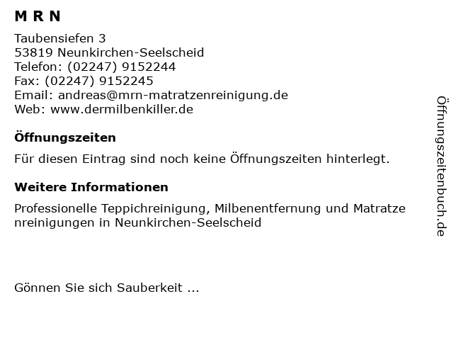 | Öffnungszeiten M R N in Neunkirchen-Seelscheid anzeigen | |