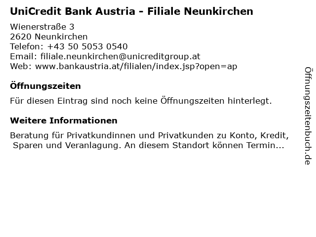 | UniCredit Bank Austria - Filiale Neunkirchen anrufen | |