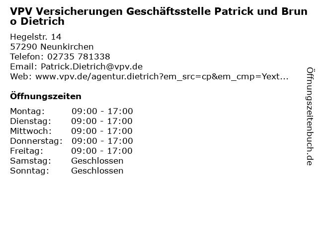 1 VPV Versicherungen Bruno Dietrich - GESCHLOSSEN (Entfernung: 0,01 km) Hegelstraße 14, 57290 Neunkirchen 4 Prettenthaler GbR Inhaber Bruno Prettenthaler, Monika Blecker (Entfernung: 12,83 km) Wiesenstr. 7, 57584 Scheuerfeld 6 VPV Versicherungen Christian Groos - GESCHLOSSEN (Entfernung: 14,31 km) Adolf-wurmbach-strasse 55, 57078 Siegen-Geisweid |