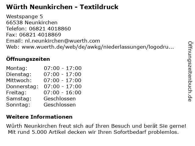 Branchen & Suchbegriffe zu Würth Neunkirchen - Textildruck:baumärkte, geschäft für arbeitskleidung, geschäft für individuell gestaltete t-shirts, textildruck, würth |
