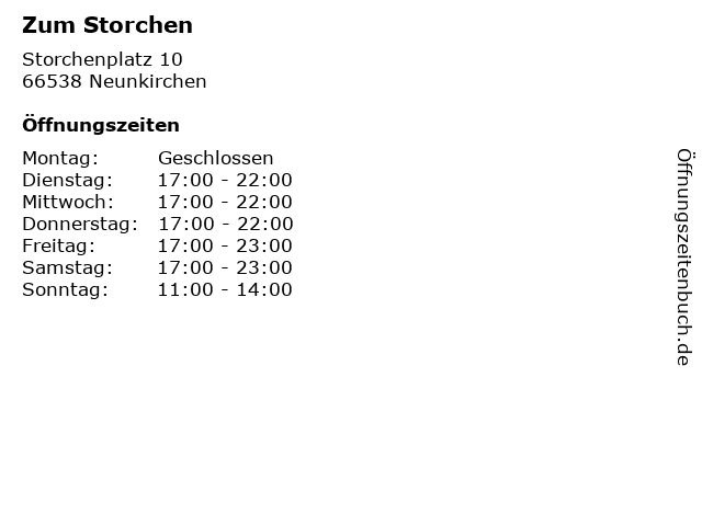 | Öffnungszeiten Zum Storchen in Neunkirchen anzeigen | |