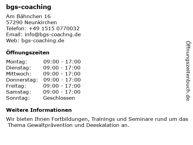 | Öffnungszeiten bgs-coaching in Neunkirchen anzeigen | |