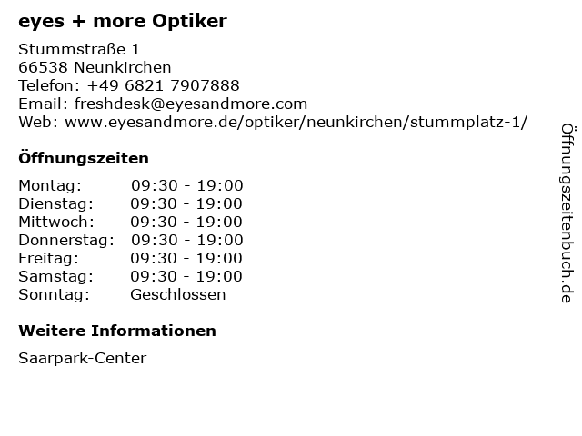 | Öffnungszeiten eyes + more Optiker in Neunkirchen anzeigen | |