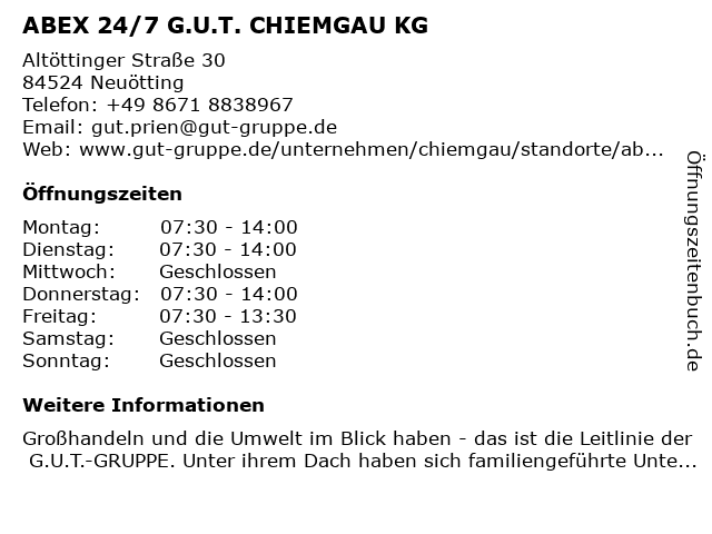 Branchen & Suchbegriffe zu ABEX 24/7 G.U.T. CHIEMGAU KG:24/7, abex, abex 24/7, abex ersatzteildepot, chiemgau, g.u.t., sortiment befestigungen, sortiment elektro, sortiment heizung, sortiment installation, sortiment klima/lüftung, sortiment reinigen-warten-pflegen, sortiment sanitär, sortiment werkzeug |
