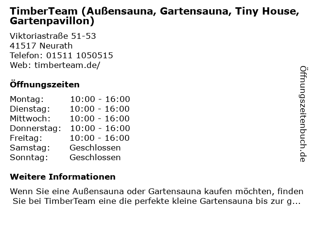 1 TimberTeam (Außensauna, Gartensauna, Holzpavillon) (Entfernung: 0,00 km) Viktoriastraße 51-53, 41517 Grevenbroich 6 |