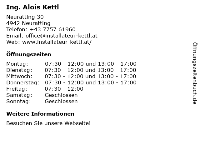 | Öffnungszeiten Ing. Alois Kettl in Neuratting anzeigen | |