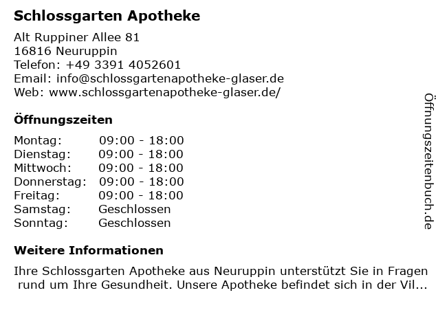 | Öffnungszeiten Schlossgarten Apotheke in Neuruppin anzeigen | |