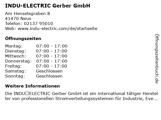 | Öffnungszeiten INDU-ELECTRIC Gerber GmbH in Neus anzeigen | |